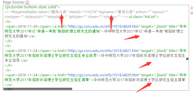 代替。因为我们要继续提取链接,所以出现了<a></a>的标签。对于链接标签的属性也可以提取,其属性被放在第一个<>内,href指的是链接的地址,一般长这个样子:<a href="http://gs.ccnu.edu.cn/xj/tzgg1.htm">,只需要把http://gs.ccnu.edu.cn/xj/tzgg1.htm替换成