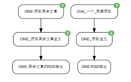 以右边为例,第一只鸟儿打开一个网页,然后获取到相关的条目url,第二只鸟儿打开这个url,然后从新的页面里提取全文。要知道,第一只鸟可能获取多个url,它获取的这些url称之为事件event,这些事件被交给第二只鸟,这只鸟比较悲催,需要一个个打开这些事件中的url,然后分别获取全文,然后再生成与之对应的自己的event。第二只鸟的event里面是获取到的url内的全文,然后这些内容被交给第三只鸟,第三只鸟把这些内容合起来,生成一个RSS种子,它自己的event,是一个网址,这个网址就是我们最终得到的RSS源。