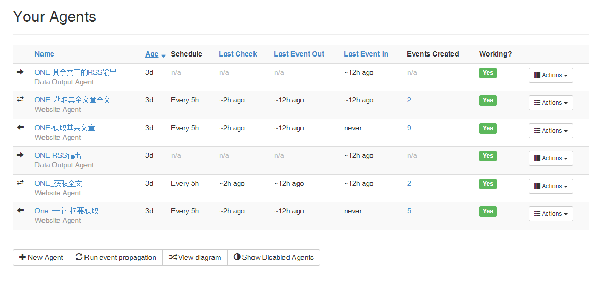单击任务栏新建一个agent,这里选择website agent,之后按照要求填入相关信息。注意:agent的名称是必填项。当你新建一个agent之后,从这个agent的菜单中选择“show”,你就可以见到如下的agent详细信息。