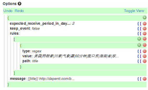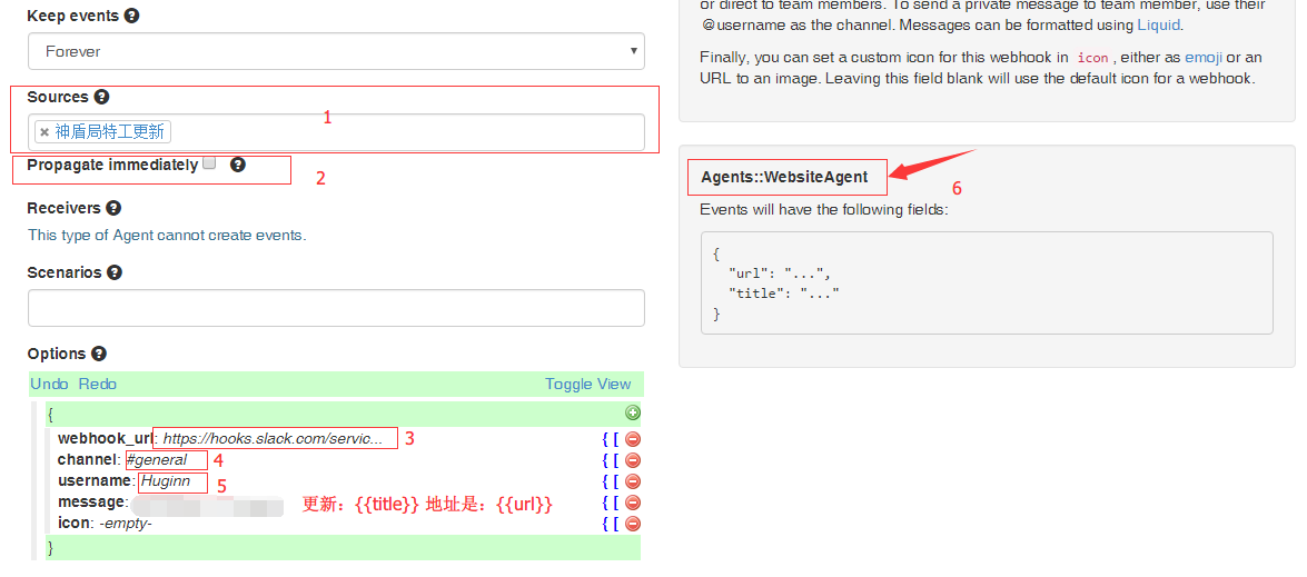 Propagate immediately(2处)的意思是当上一个Agent生成事件后立马唤醒此Slack Agent。一般,这样会造成较高的CPU使用,我选择不理会这个选项,默认情况下,Huginn会每分钟检查一下你的Agent,看有没有事件需要处理,所以不选的话,顶多1分钟后再推送消息,对我的差别不大。