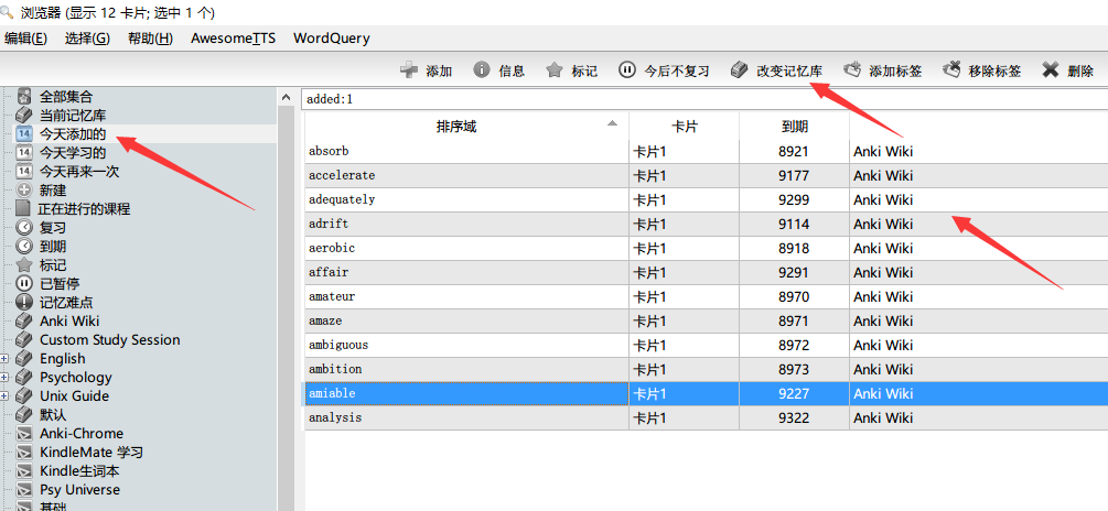 附注:有时候导入后,可能有一些问题。在浏览器中选择”今天添加的“选项卡查看。比如有时候记忆库不对,那么在此选项卡下按下Ctrl+A全选笔记,然后选择改变记忆库(箭头所示)即可。