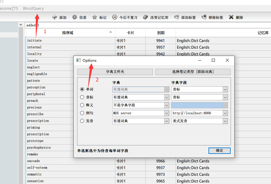 如图,选择你需要补充的单词,点击WordQuery菜单的Option选项,打开选项窗口。如果你试用了和我一样的模板(欧路词典),那么按上图设置即可,单选框选中的部分是需要查询单词所在的区域,选中后此区段就仅仅作为查词的用途,其“字典字段”不起作用。音标我们选择有道的“音标”,释义、例句等下面的类似。如果你使用了我的模板,那么释义可以不选,例句选用有道的柯林斯英汉即可,这个柯林斯包含例句和释义。当然,你也可以用MDX Server选择一本自己的词典,具体使用方法见一下两篇文章: