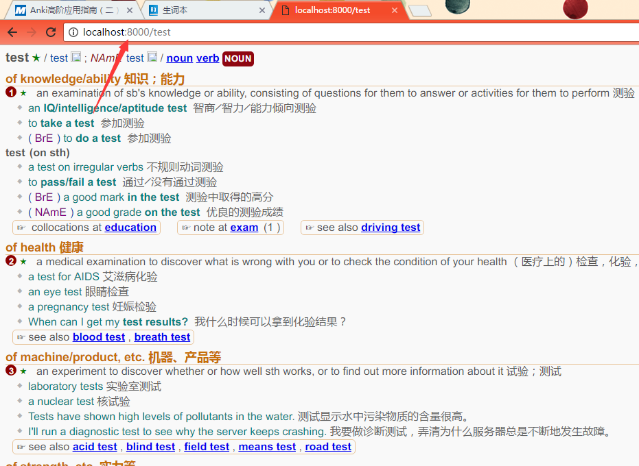 如下图打开服务以及选择你的词典,我用的是牛津高阶第八版,点击“打开”。等一会,在浏览器输入 http://localhost:8000/test 来测试下是否服务正常,这里的test字段即是你要查的词。