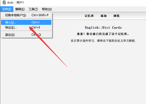 打开Anki,选择你一个目标记忆库,点选 文件 > 导入(或者直接按下Ctrl+I)。