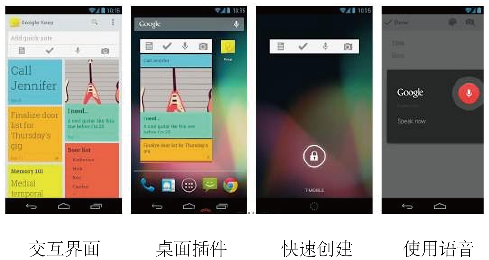 从Google Keep的整体解决思路来看,整个待办事项/日程管理/备忘录系统和非触摸屏时期走的是同一条路子,信息的编辑和处理、信息的快速展示、信息的快速创建,这三个层次的优先级应该越来越高,这些年偶有对这个范式进行修改的恐怕就是语音创建这一超快速的记录方式了(如图最右边所示,语音甚至比在锁屏界面点击图标有更高的操作效率来创建一条备忘录)。
