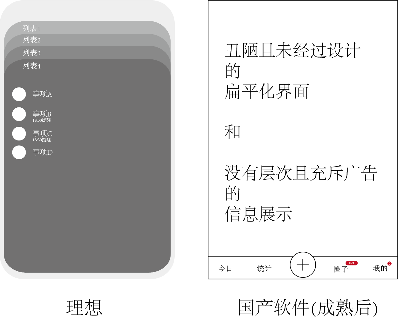 我希望待办事项是这样的:包含多个列表,每个列表包含一些有截至日期和不含截止日期的事项,还有一些每周的通知、每天的通知。对于软件来说,设计必须足够的简单,足够的只关注内容而不是其他的,比如分享、比如广告。待办事项可以很好的展示在手机最醒目的位置,并只做展示而不易编辑。同时,创建待办事项,或者形成一个思想要快速的被记录,最好在5s内掏出手机就可以完成这一步骤。