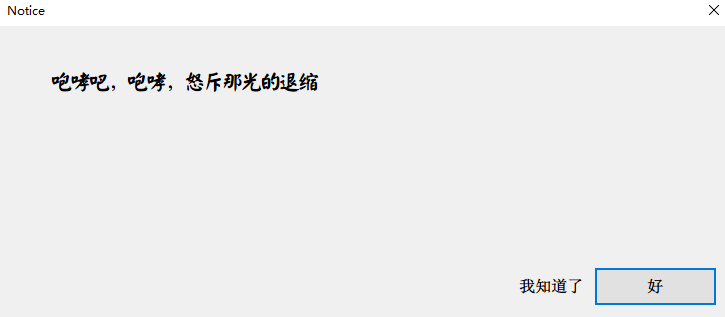 这个界面会随机显示一句鸡汤,在右下角有两个按钮,左边的不明显,并且很小,很难用鼠标点到,并且在心理上不会被认为是按钮;右边的很大,很容易点到。这两个按钮的文字含义基本类似,但是稍有差别,按下左边的按钮,系统会自动退出程序,不再提醒。按下右边的按钮,窗口2会自动关闭,窗口1还在,并且自动隐藏,在4分钟后继续提醒你写日记。