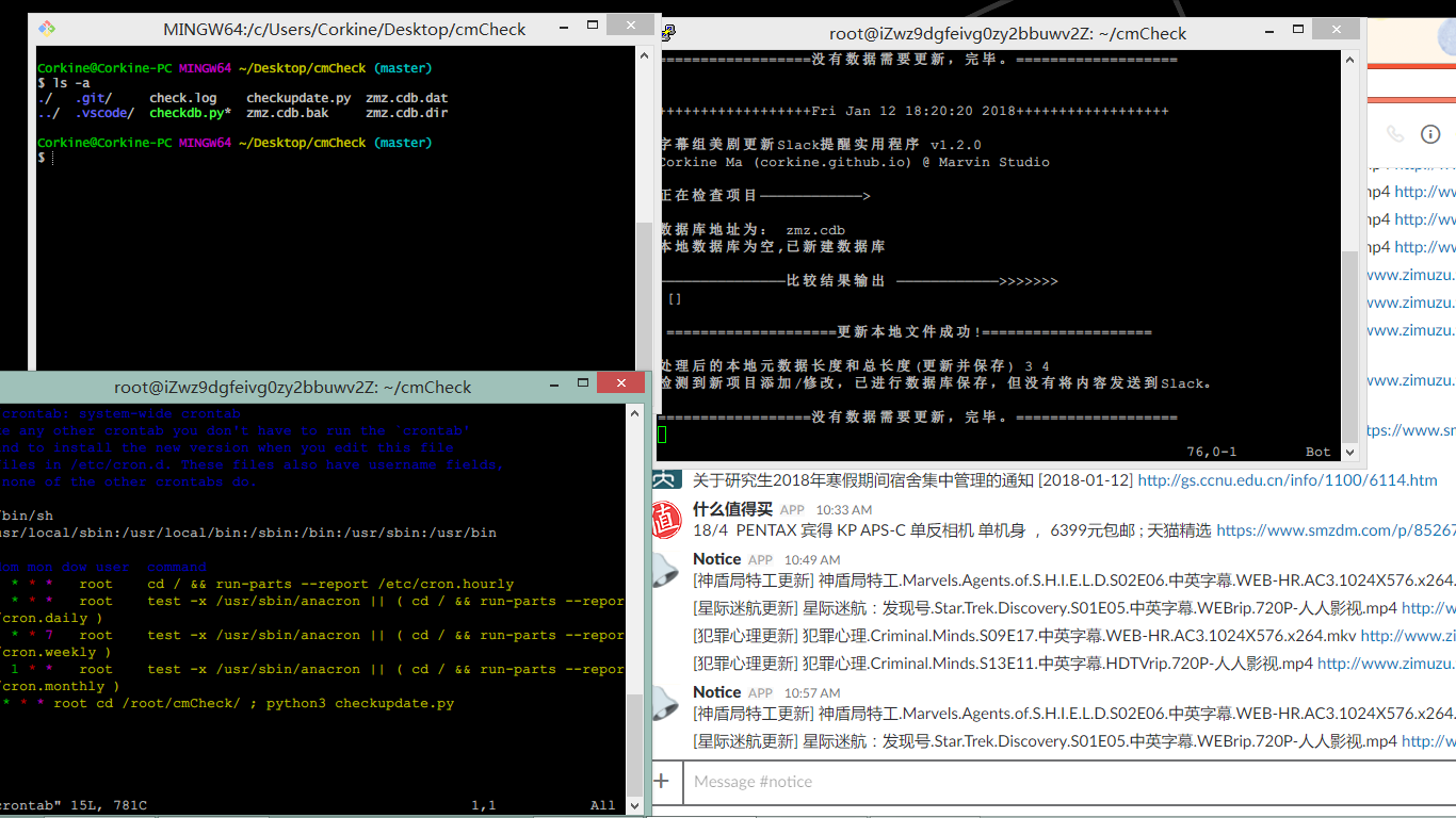 大概思路很简单,使用lxml的xpath规则从字幕组提供的XML RSS中提取内容,和本地数据库进行比较,如果本地没有的话,那么就使用webhook推送更新到Slack。程序使用cron定时执行,放在服务器上,截获输出流到文件作为日志。