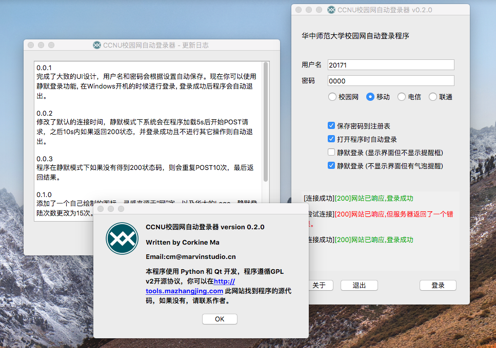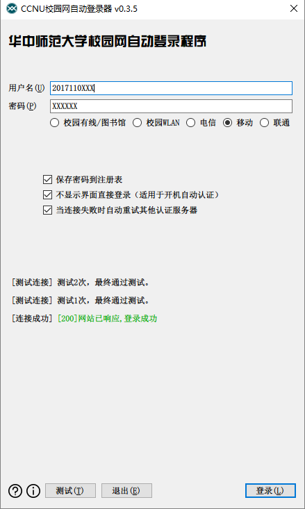 本程序可用于华中师范大学无线校园网(SSID:CCNU)以及有线校园网的连接认证,可以替代网页认证。本程序适用于解决:1、开机程序自动登录网络,而无须手动干预。2、连接网络后打不开认证界面(尤其是宿舍晚上以及图书馆等人较多的地方)。由于学校网络认证复杂,新旧混乱,因此程序提供了自动切换认证服务器的功能。