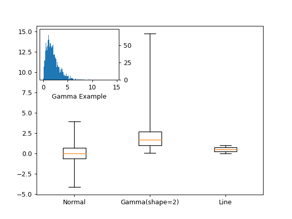 bp = plt.boxplot([n_data,g_data,l_data],whis='range',labels=['Normal','Gamma(shape=2)','Line'])